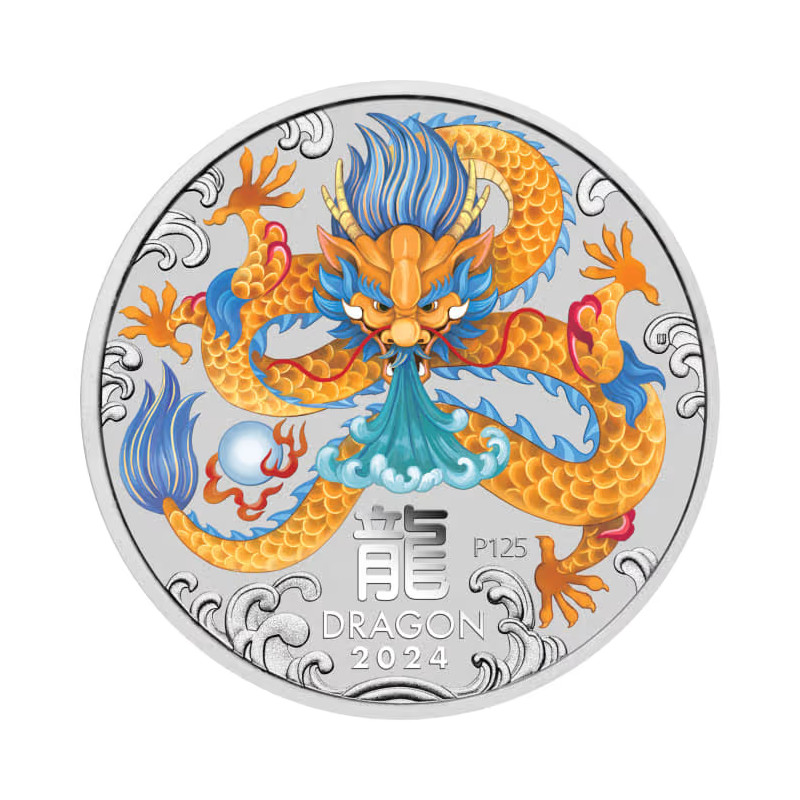 Strieborná kolorovaná minca z austrálskej Lunárnej série III – Rok draka 2024. Séria vychádza z čínskeho lunárneho kalendára a každoročne prináša nové stvárnenie zvieraťa daného roka. Minca je razená z dvoch uncí rýdzeho striebra (999,9/1000) prestížnou mincovňou Perth Mint. Výrazný farebný motív draka symbolizuje silu, šťastie a ochranu, čo z tejto emisie robí výnimočný zberateľský kus.